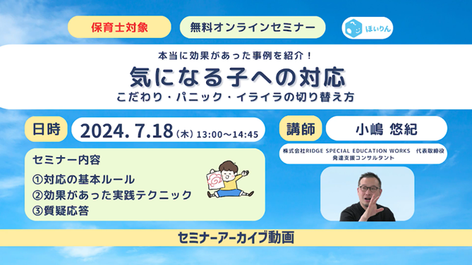 小嶋先生には、この「週刊ほいはう」の中でも『気になる子への接し方』について解説していただいており、今回のオンラインセミナーは、その内容をより深く理解していただくために企画したものです。当初は300名の募集でしたが即時満席となり、400名に増員したところ、増員分もすぐに満席となりました。たくさんのご応募ありがとうございました。