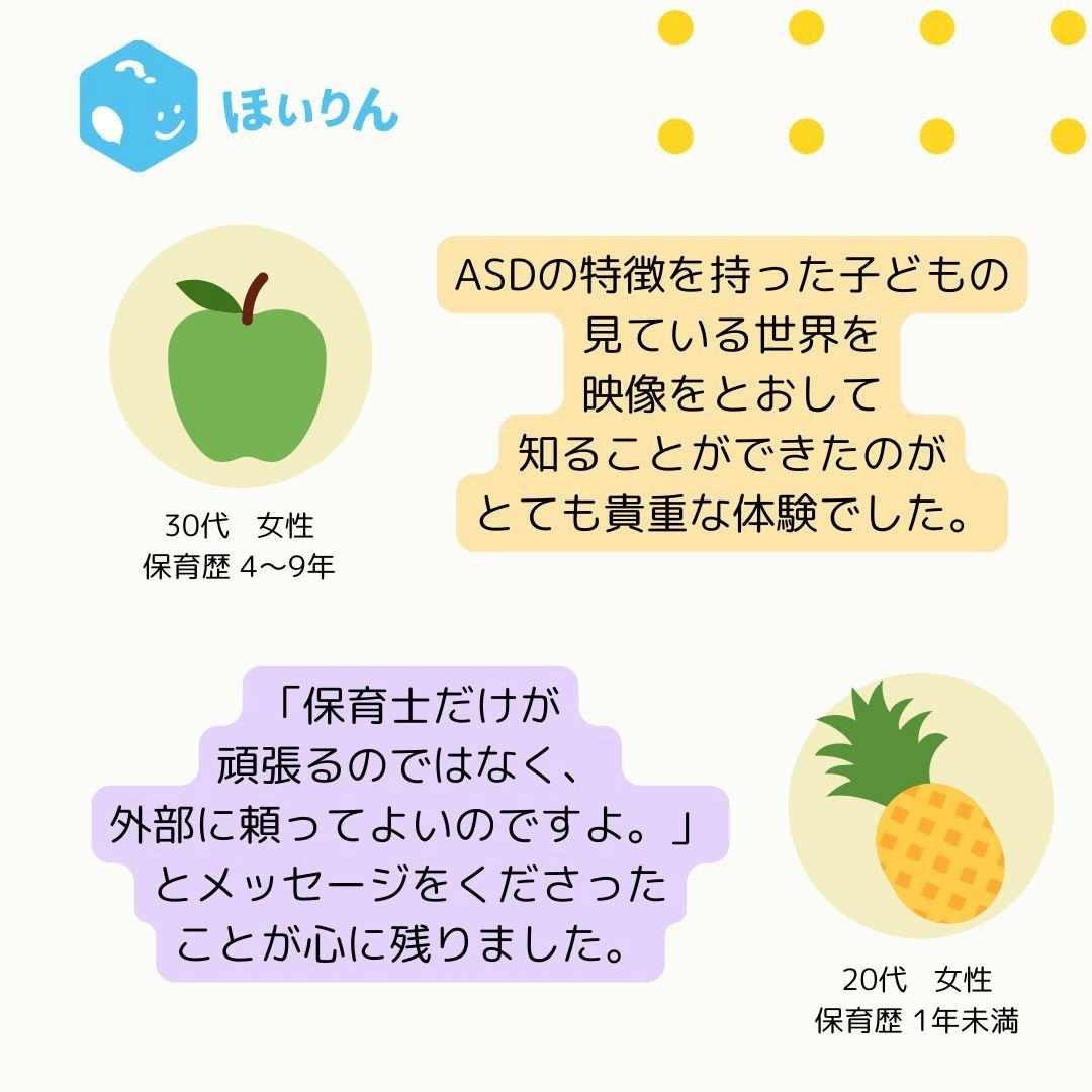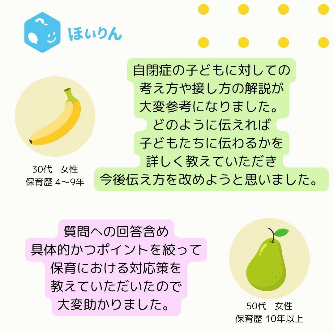 「このようなオンラインセミナーに参加してくださる先生方が数多くいらして、とても心強く思います。発達障がいの子どもたちは先生たちに出会うべくして出会っています。それはどのようなメッセージなのかと考えると、先生がたは、いつもその子どもたちのために沢山工夫なさるじゃないですか、優しくなさるじゃないですか、その優しい工夫は子どもたちのためだけではなく、他の人や社会的な事象についても向けられていると思うのです。つまり、彼らの存在が社会にもっともっと優しい人たちをあふれさせよう。という神様からのメッセージだと思うのです。保育士の皆様のお仕事は本当に過酷であり、報われると感じることが難しいこともあるかと思いますが、私は『人を育み、育てる』という仕事は神様にしか許されない仕事だと思っています。そのような仕事を選んでくださった先生がた皆様と共に日本を明るい方向へもっていこうとしていること、それは誇るべきことだと思います。大変なこともあるかと思いますが子どもたちの将来ために、幸せな社会のために一緒にがんばってまいりましょう。」